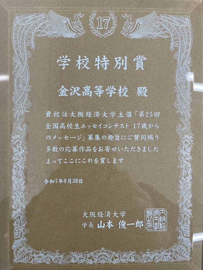 全国高校生エッセイコンテスト銀賞受賞【2025.9.30】大阪経済大学主催の第25回全国高校生エッセイコンテスト「17歳からのメッセージ」において本校の生徒2名が銀賞を受賞しました。また、学校として学校特別賞の盾もいただきました。長年このコンテストに応募していますが、銀賞を受賞したのは初めてです。今年は30,827作品の応募があり、銀賞に62作品が選出されました。