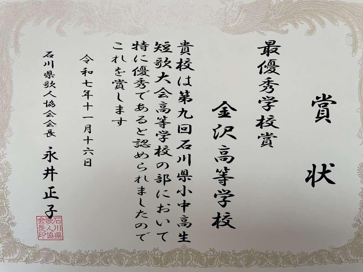 第9回石川県小中高生短歌大会【2025.11.17】第9回石川県小中高生短歌大会が開催され、応募校数16校、応募総数1,811首の中から高校生の部で優秀な成績をおさめました。