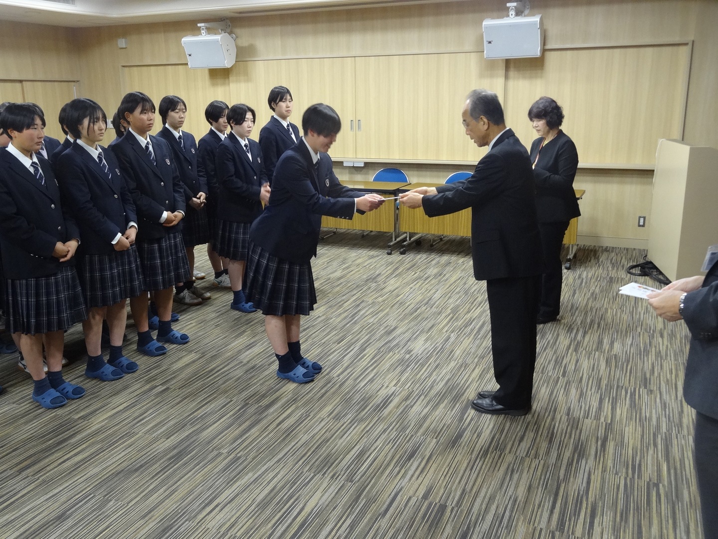 全国選抜大会激励会【3/16】全国選抜大会に出場するソフトボール部18名、剣道部女子7名、男子テニス部1名、女子テニス部1名、柔道部女子1名、合計28名の激励会を行いました。杉浦学校長の激励の言葉と各部選手の決意表明のあと、激励費が贈呈されました。