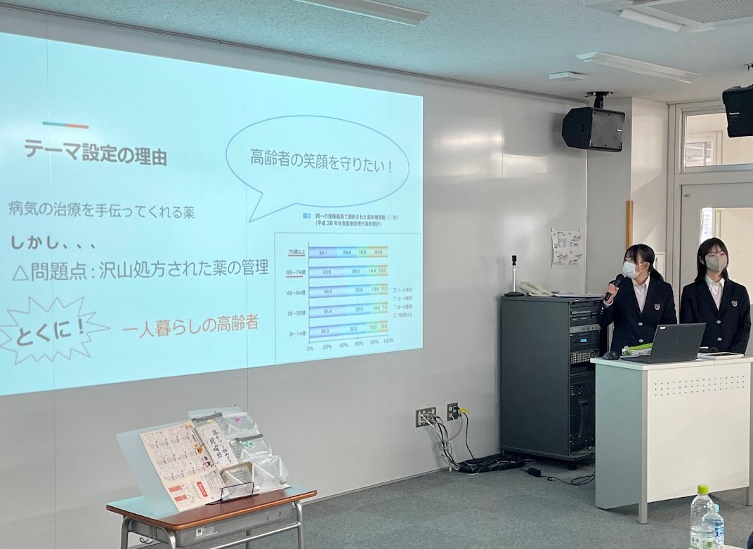 2年生の探究発表がありました【2026.3.10】2年生が1年間取り組んできた探究活動の発表が連携3大学の先生方を審査員としてお招きし、開催されました。テーマごとにグループを作り、調べ学習やフィールドワークを通して本発表を迎えました。20のテーマから1チームずつ選抜し、5チームごとの準決勝ラウンドを勝ち抜いた4チームによって決勝ラウンドが行われました。その結果、「薬学分野」代表の2年1組 樋口みことさん、三谷優來さんのチームが優勝しました。このチームでは『一人暮らしの高齢者の薬の飲み忘れを防ぐには?』を探究テーマとして発表されました。※画像は優勝した2人の発表風景です。