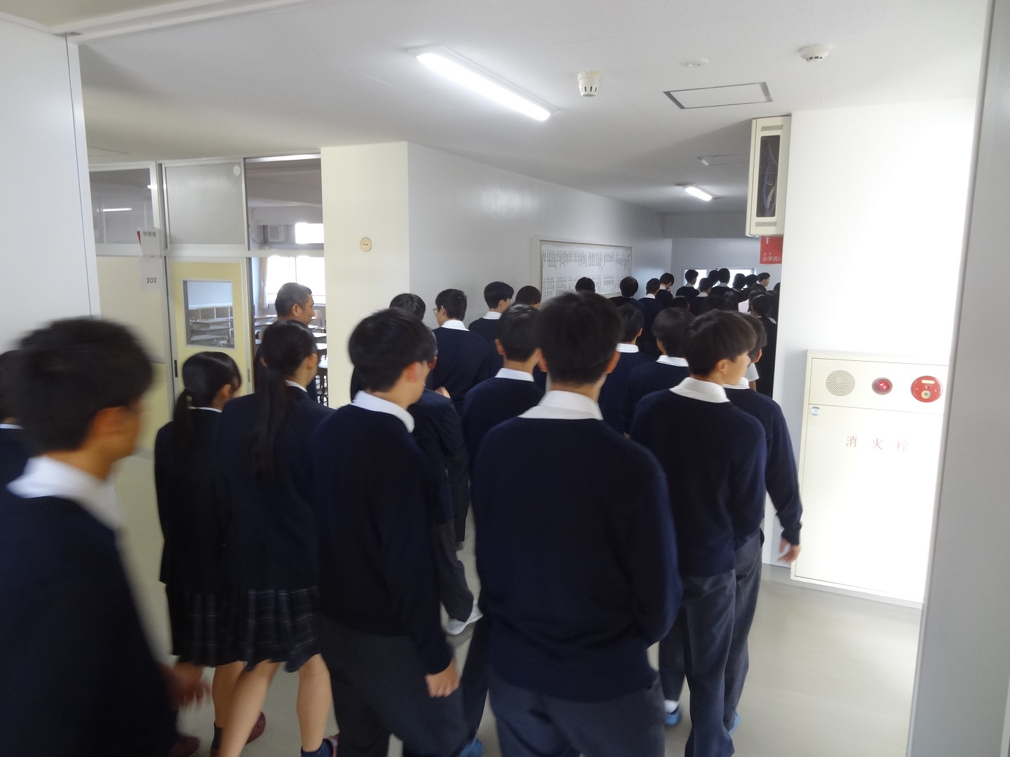 第2回防災訓練【10/23】今年度2回目となる避難訓練は事前通知なしで行われました。訓練後、日頃から防災意識を高く持ち、安心・安全な学校生活に努めてほしいという副校長の言葉がありました。また、訓練全体の総括が行われ、全校生徒約1,400名が活動する校舎において、避難完了の報告に要した時間は18分であったと報告がありました。この時間は非常に迅速であり、高く評価できるものであるとの見解が示されました。生徒・先生方が冷静に行動してくれたことに対し、感謝の意が表されました。