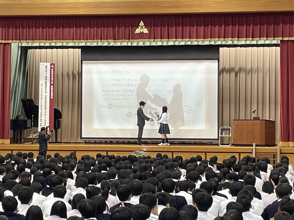 理事長・学校長の挨拶に続き、本校卒業生でJOKER’S株式会社代表取締役の松村拓馬氏による講演が行われました。松村氏は「夢は変わってもよいが、人生の幸福を最優先に」「思考は現実化する」「好きや得意を武器に専門性を高める」など、経験をもとに熱いメッセージを語り、生徒たちは真剣に耳を傾けていました。 -