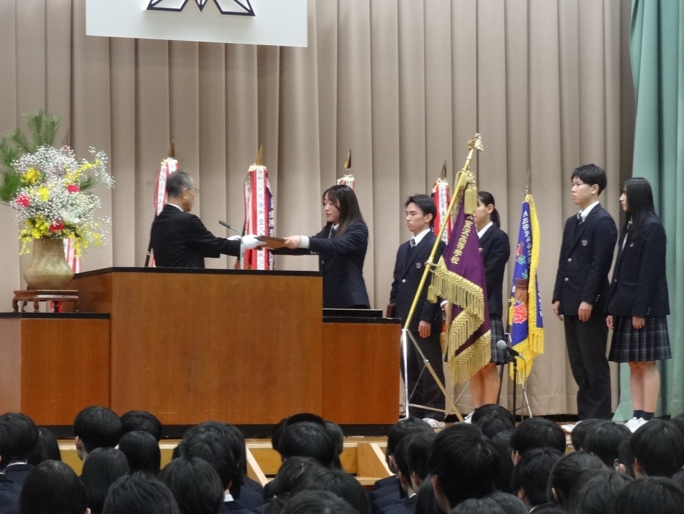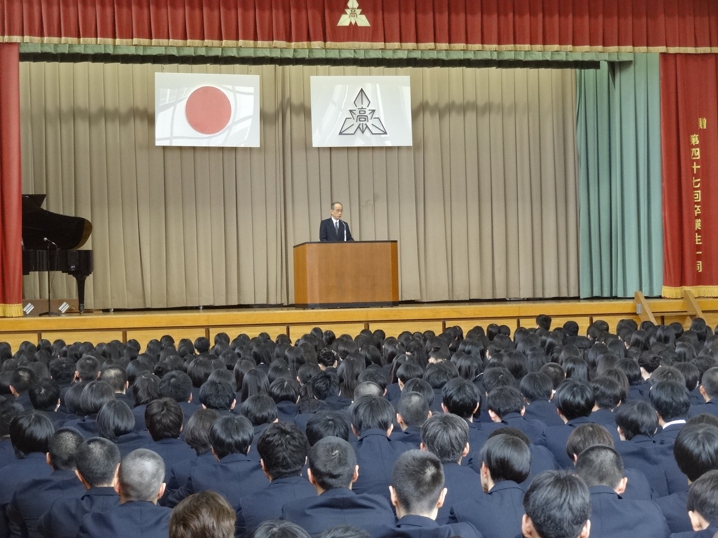 さらに、部活動や学業、進路面での今年度の成果が紹介され、生徒たちの努力が実を結んでいることが称えられました。一方で、挨拶や清掃、時間厳守、授業態度など、学校生活の基本に関わる課題にも言及がありました。「人間教育」を学校の原点とし、来年度に向けて一人一人が基本を大切に行動してほしいとの強い願いが述べられ、訓辞は生徒への期待と励ましの言葉で締めくくられました。 -